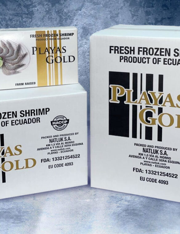 This is Our Playas gold brand for farm raised shrimp our main brand that represents the origin and identity of our product.
